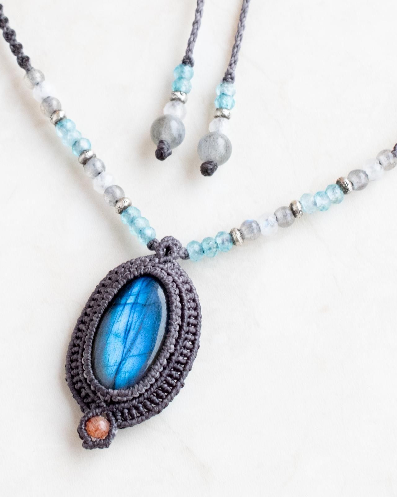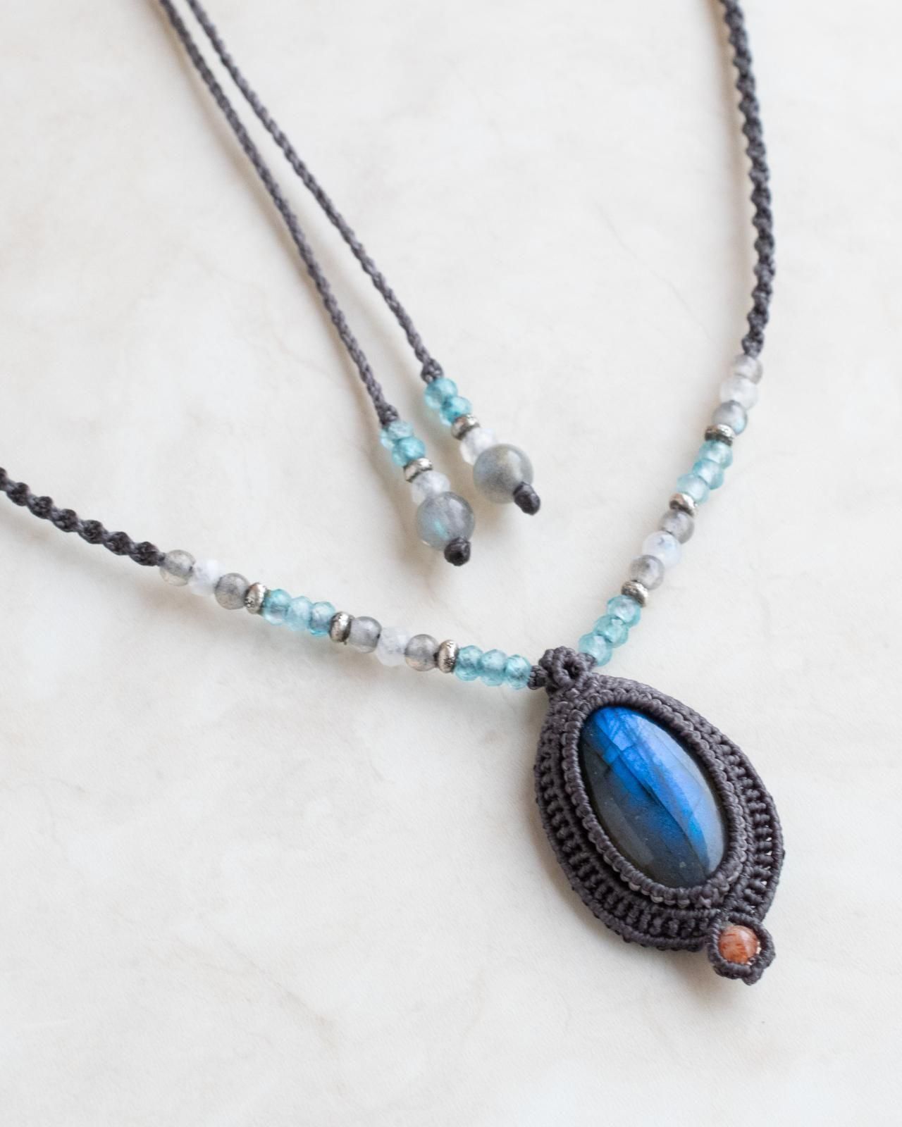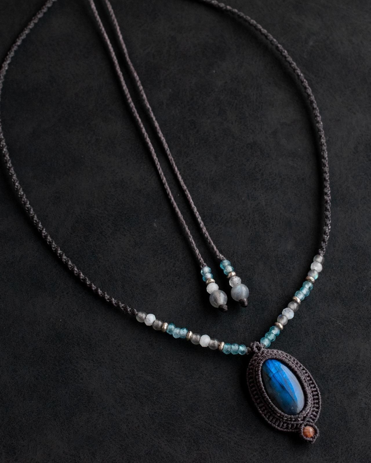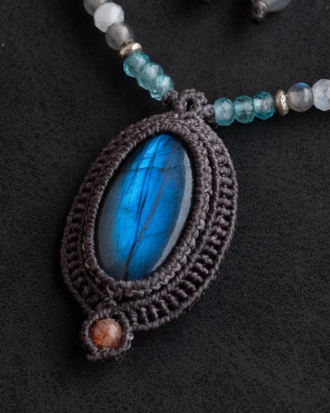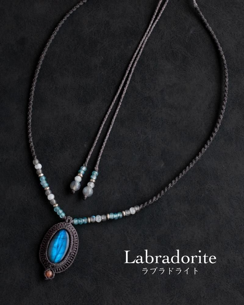 ラブラドライトの周りにマクラメ装飾を施すことで存在感を出しました。